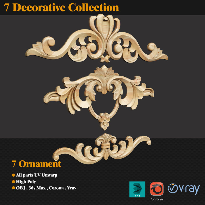 This file contains four ornaments with high polygons. You can use this product in the interior decoration of classic scenes. This product is in the category of classic products. I tried to do this model with the utmost care and elegance. All objects are uv unwraped and you can use another texture on them without any hassle. You can even apply that color. This product can also be used on classic objects. Including objects such as: dresser, classic chair, classic bed, classic wardrobe and ...... I have modeled them with 3D Max. Can be used for both Corona and Vray rendering engines. There is also OBJ file in this product. You can apply the Turbo Smooth command if you need objects to have better quality. Of course, I have tried to manage the number of players so that your scene does not take up too much RAM on your system. I hope you enjoy this and support me. Thanks