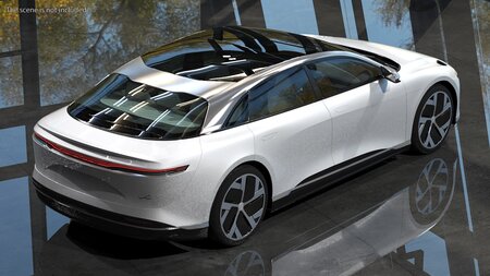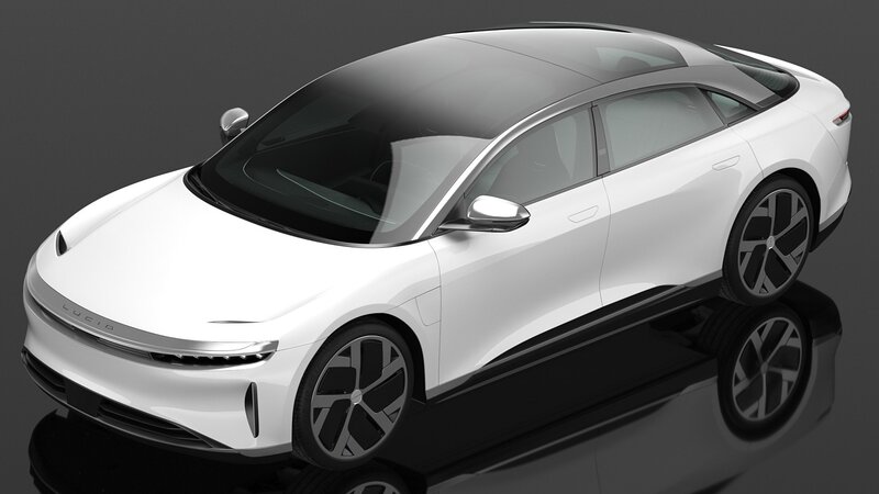 The futuristic high tech electric luxury Lucid Air sedan all-wheel-drive plug-in EV car transport.