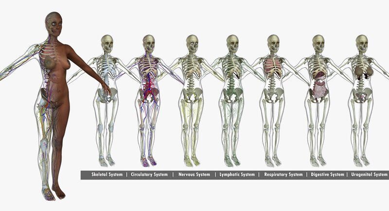 The Male / Female Full Body Anatomy includes full body skeletal systems with connective tissue, circulatory systems, nervous systems, lymphatic systems, digestive systems, respiratory systems, and urogenital systems.