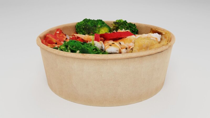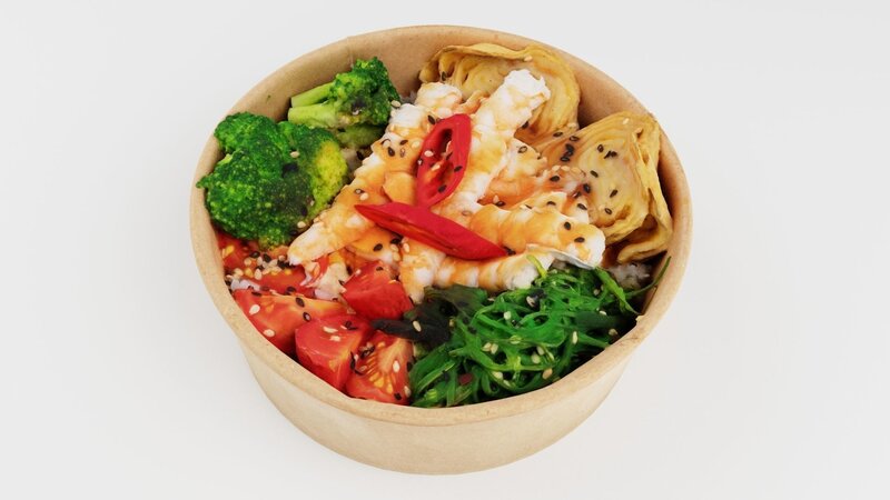 Poke bowl with king prawn or caramote prawn and Teriyaki sauce