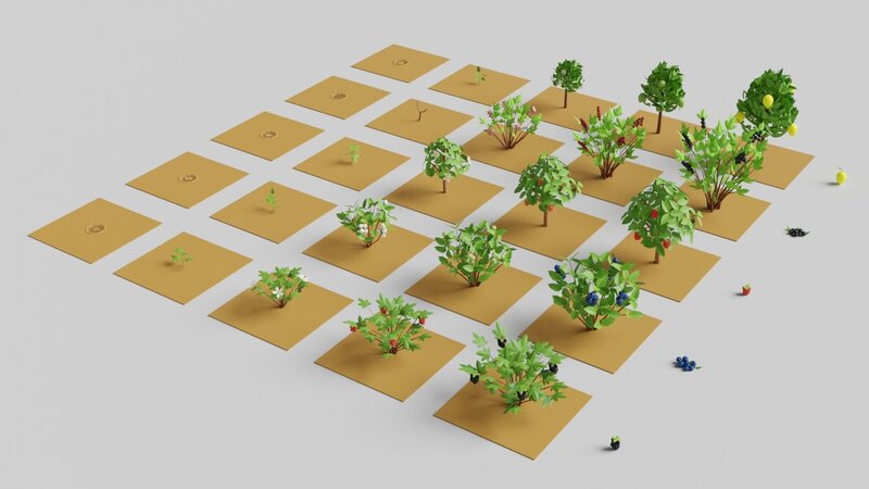This package contains 45 packs of low-poly fruit trees set, each one has 5 stages of growth with 45 types of fruits, 4 variety dirt. There is 1 file that includes all models and there is also a file that is separated into 274 files each (45 fruits, 225 trees, 4 items).